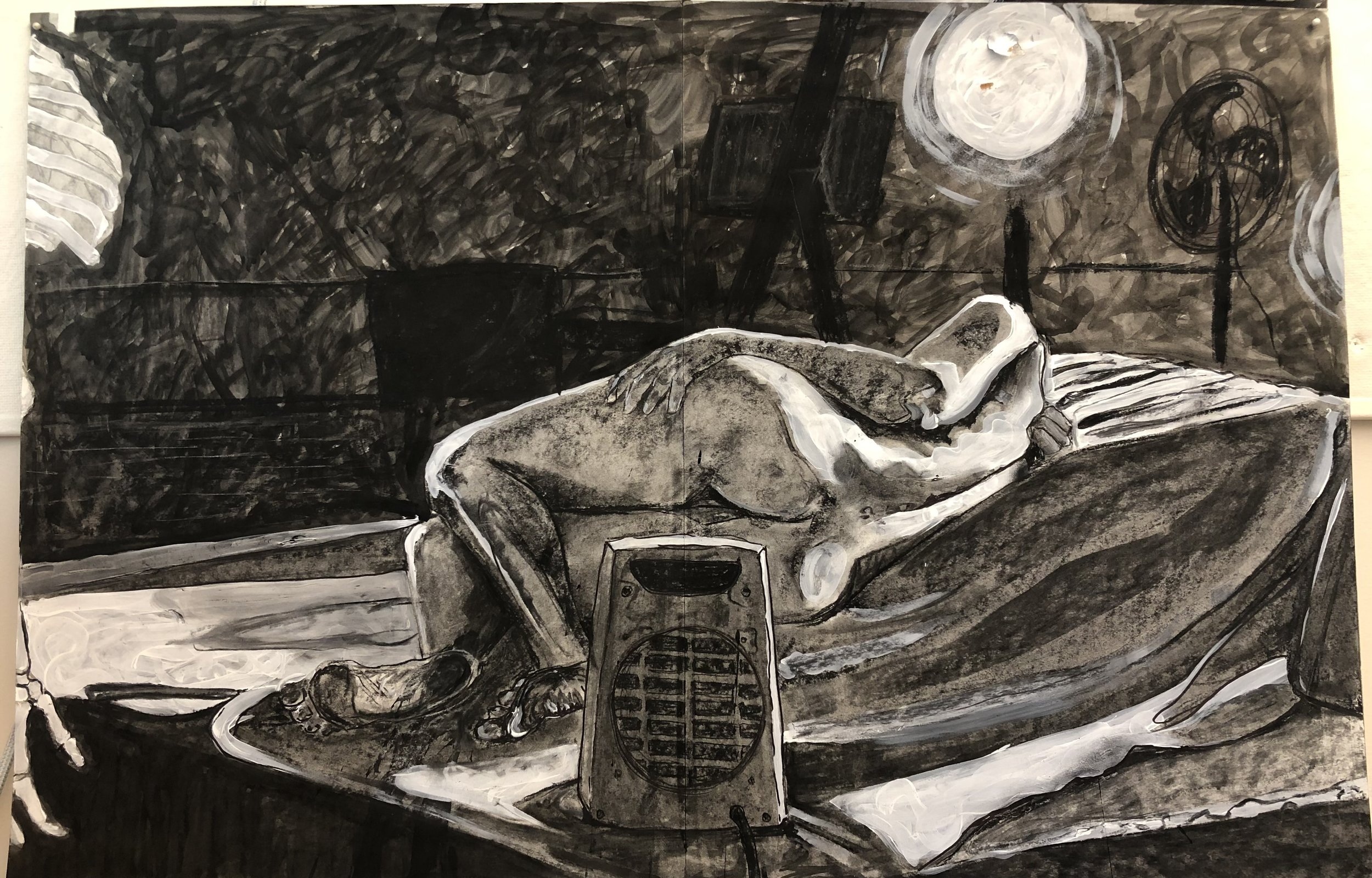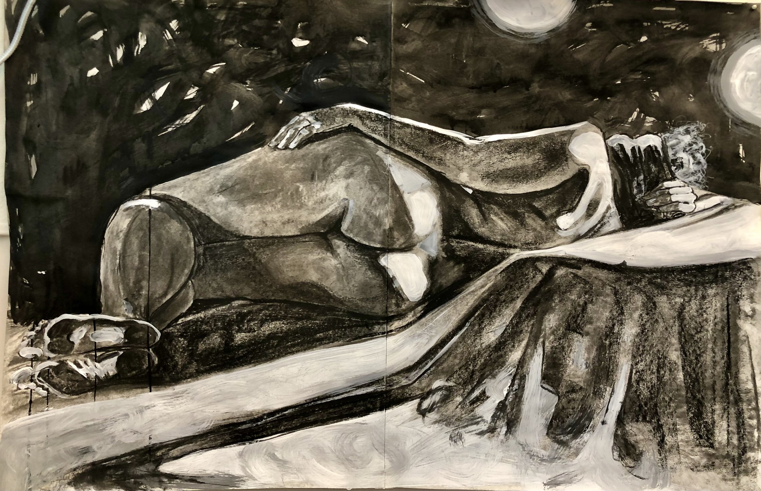 Dual Figure Drawings, gesso, india ink, charcoal, both 36x48”, 2020
